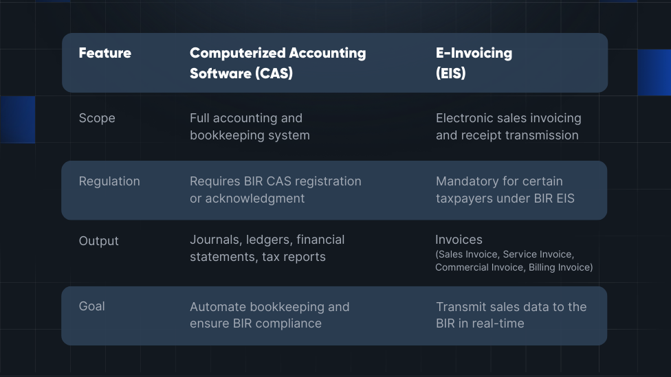Learn the difference between the Computerized Accounting System (CAS) and the BIR Electronic Invoicing System (EIS), and why both matter for compliance.