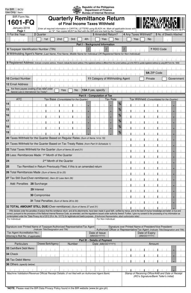 BIR form 1601-FQ, or the Quarterly Remittance Return of Final Income Taxes Withheld is a tax form which is used to remit all other forms of final withholding taxes.