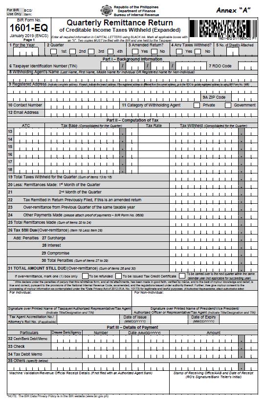 BIR Form 1601-EQ or the Quarterly Remittance Return of Creditable Income Taxes Withheld is used on remitting taxes that are withheld during the 3rd month of each taxable year.