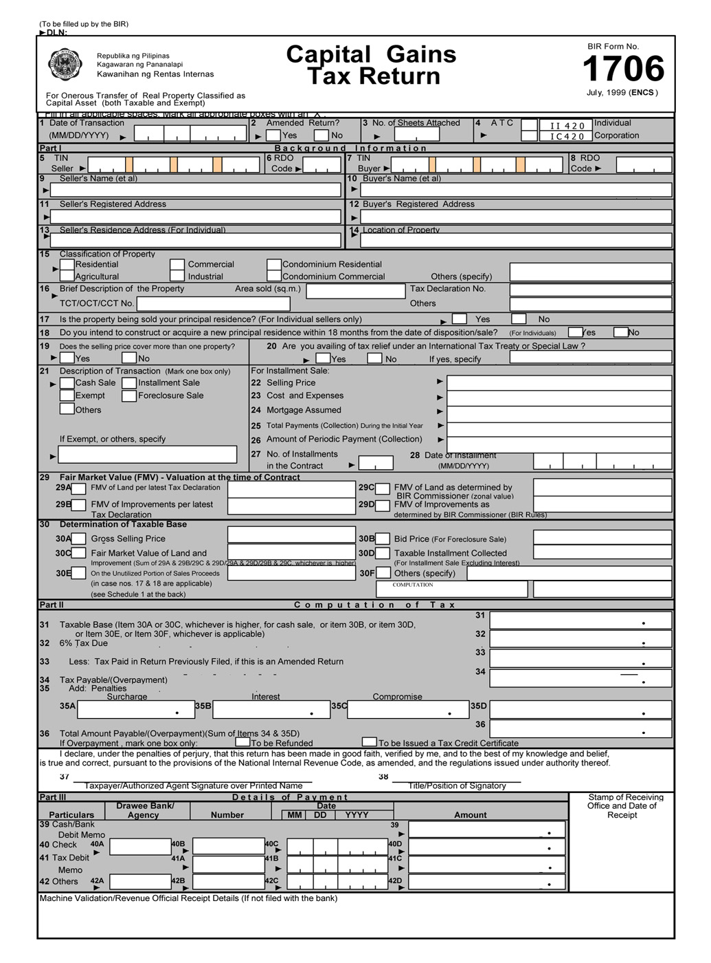 The Capital Gains Tax Return (BIR Form No. 1706) shall be filed in triplicate copies by the Seller/Transferor who is natural or juridical whether resident or non-resident, including Estates and Trusts, who sell, exchange, or dispose of a real property located in the Philippines classified as a capital asset as defined under Sec. 39 (A) (1) of RA No. 8424. The term “sale” includes pacto de retro sale and other forms of conditional sales. The transaction may be taxable or exempt.