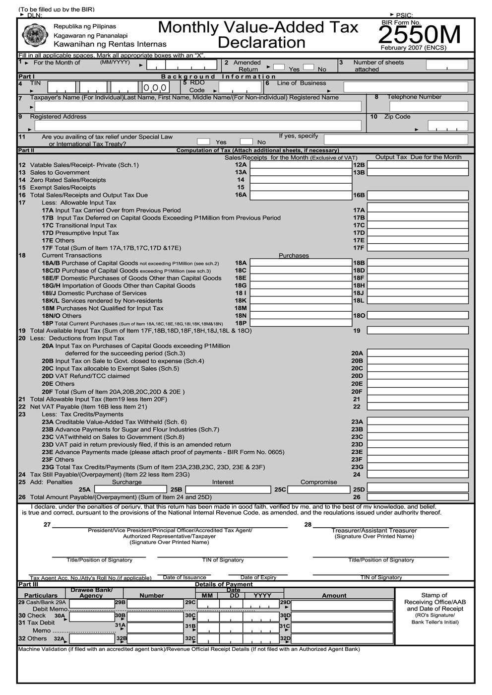 BIR Form 2550M, or also known as Monthly Value-Added Tax Declaration is a form of sales tax which is imposed on sales or exchange of goods and services in the Philippines. Serving as a form of indirect tax, VAT is passed on to the buyer which consumes the product/service.